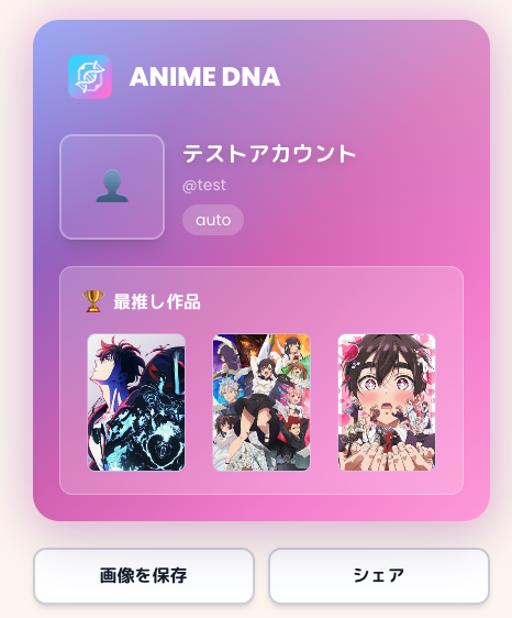最推し作品5つと視聴傾向タイプを1枚の画像に。SNSでシェアして、趣味の合う人を見つけよう。あなただけのアニメ視聴DNAを可視化します。