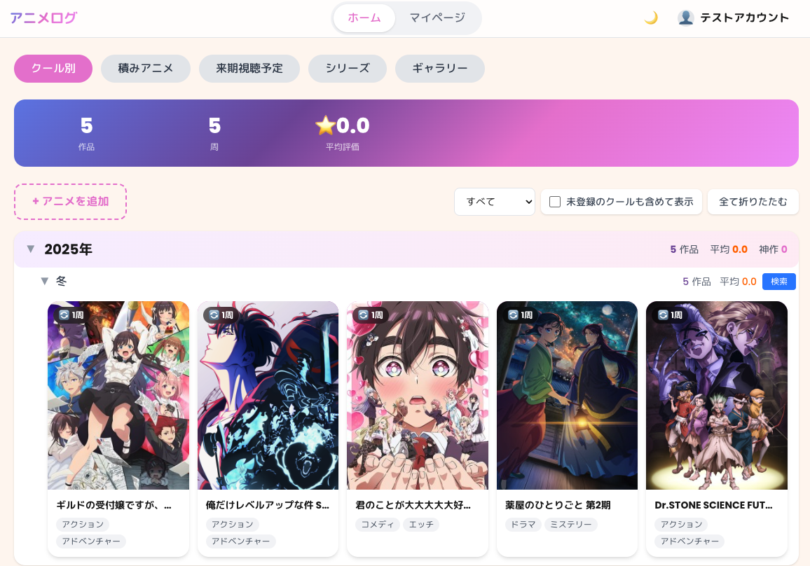 春・夏・秋・冬のクールごとに視聴アニメを整理。シーズンごとの視聴傾向を把握できます。過去のクールも振り返りやすく、見逃した作品もすぐに見つけられます。